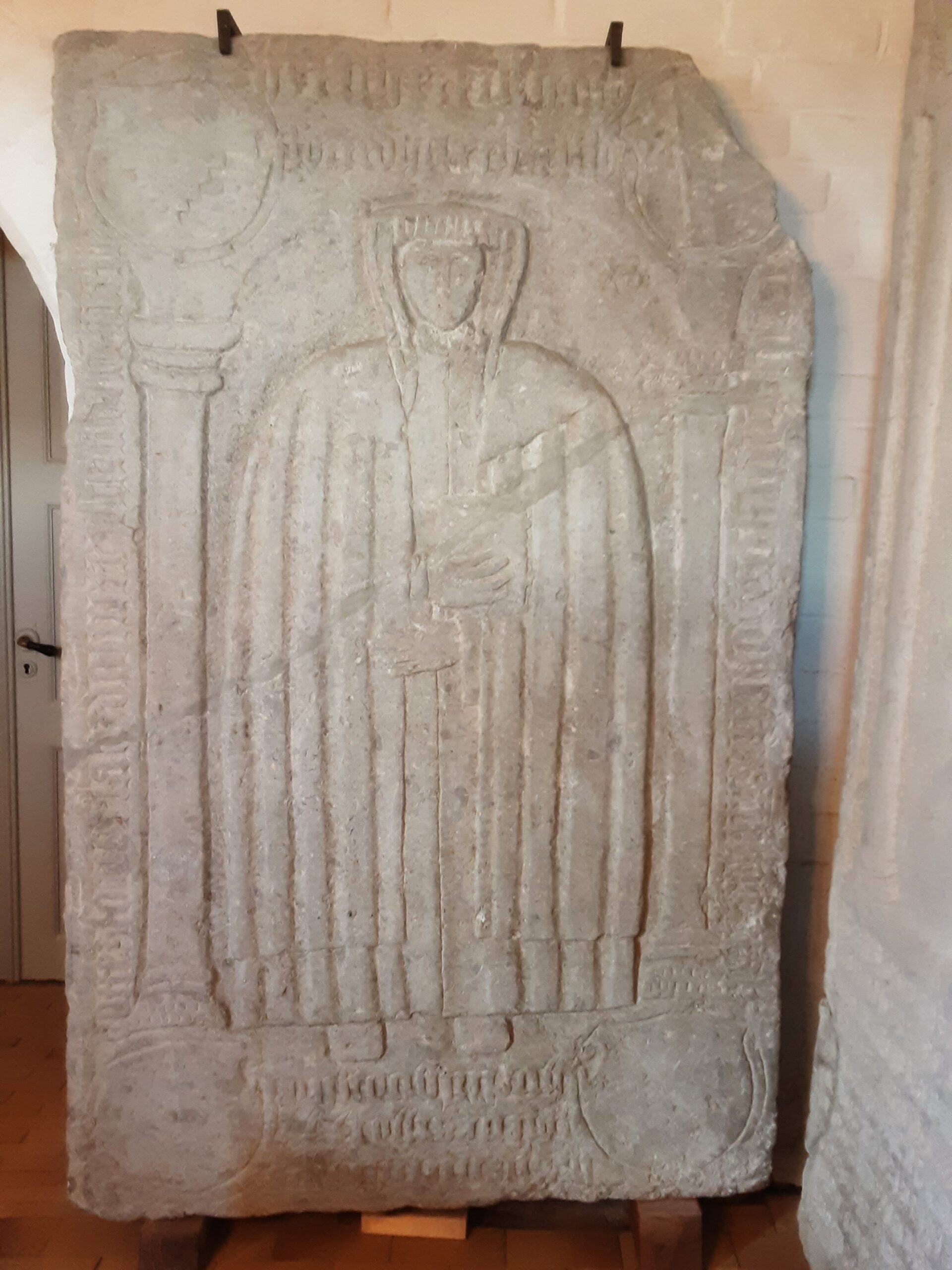 Hvem er kvinden på gravstenen i kirkens våbenhus til højre for døren ind til kirken? Kvinden i den store, formløse...